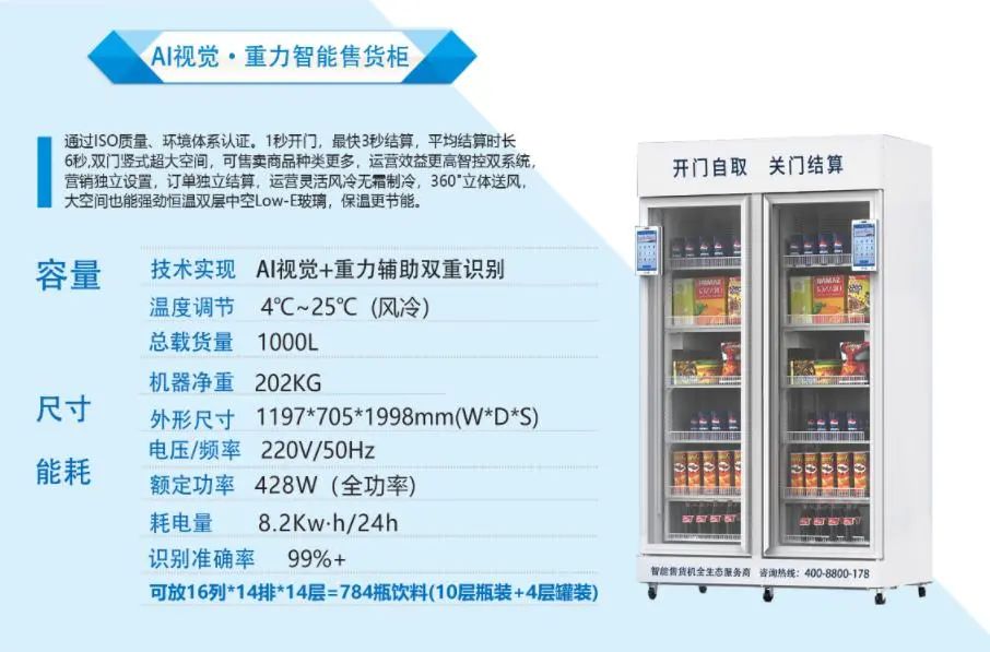 双门自取柜,通过ISO质量,环境体系认证。其具有高校节能的制冷、锁冷、隔热保温功能,可24小时连续运转,扫码开门,随心拿取,实现真正自助售卖。还有节能环保设计和多重摄像头防盗设计,使用更加放心。微信或支付宝扫码开门,即可拿取商品,关门后自动结算。